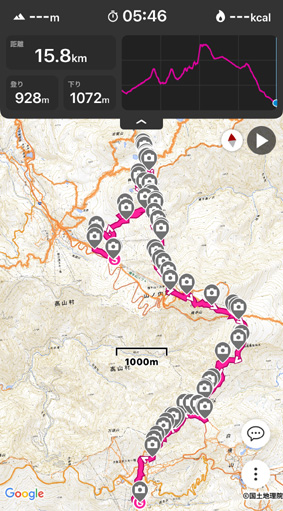 総距離は今日も15kmほど、約1000m登って1000m降りるので今日もそこそこハード。