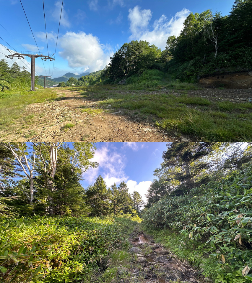 開けたところに出るとスキー場のゲレンデで、登りきると横手山のリフト乗り場に出ます。