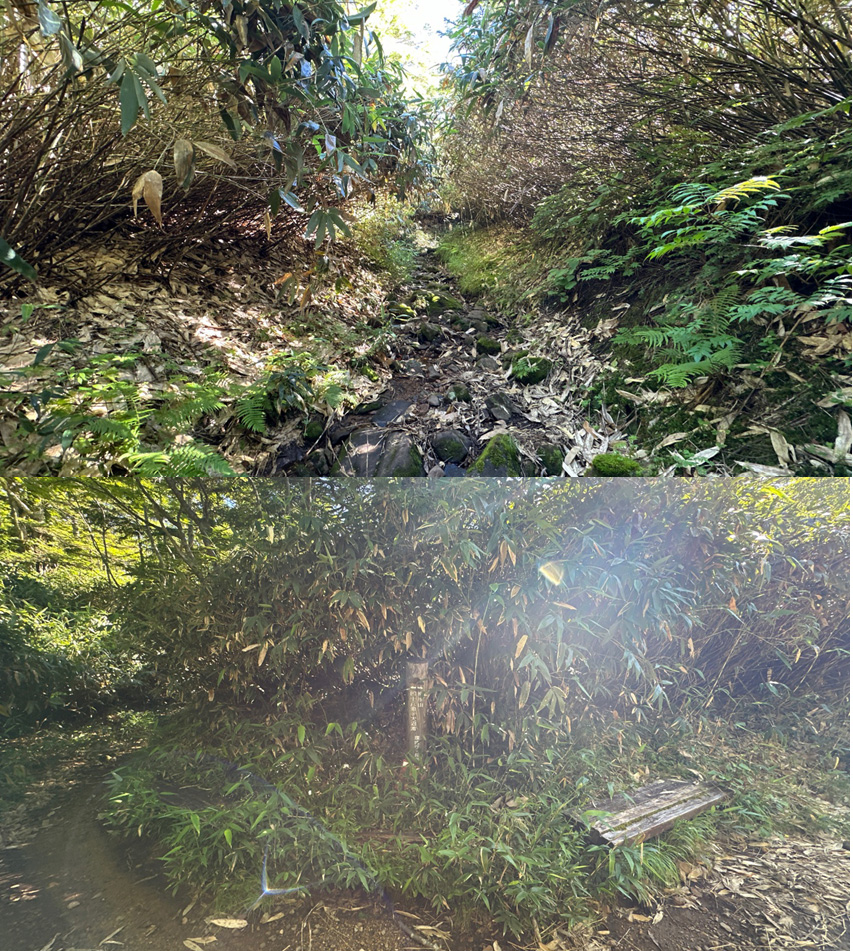 石がゴロゴロして雨でえぐられた細い道。まあ歩くには支障ないですが。