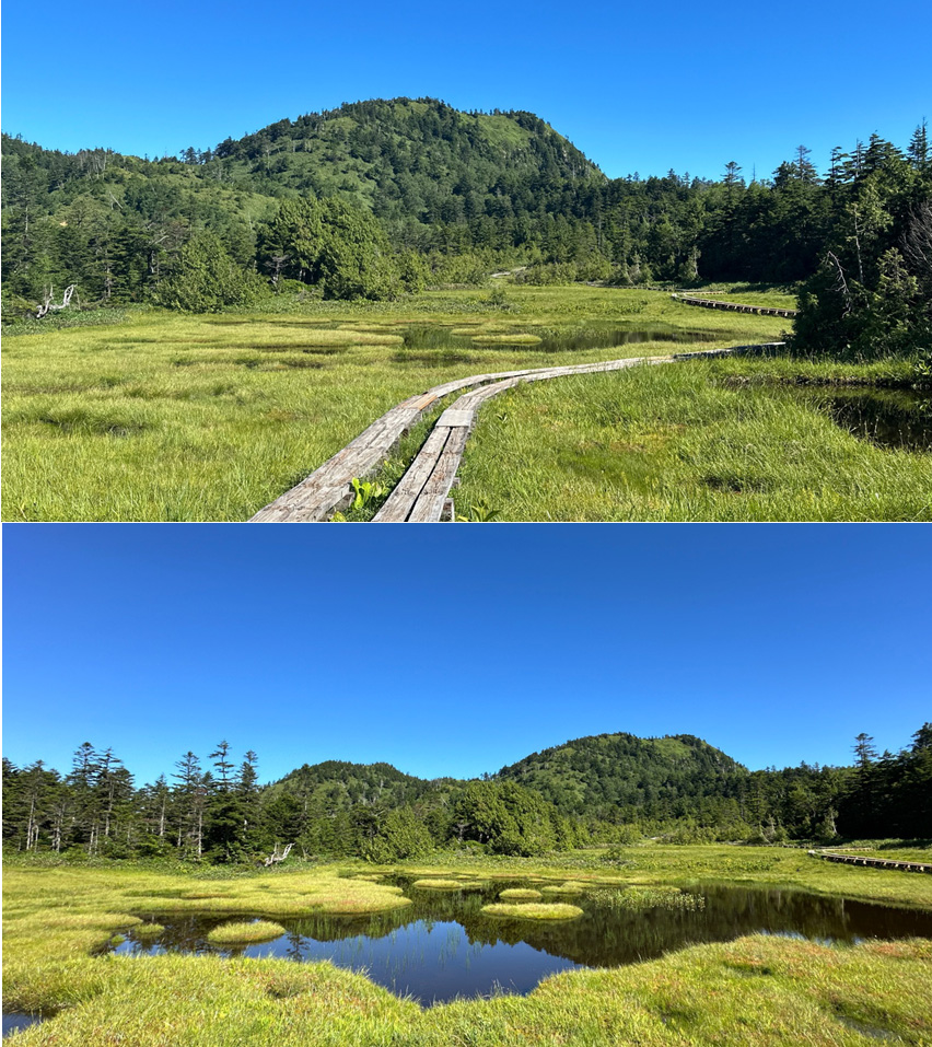 湿地帯に木道がかけられていて、奥のほうに見えるのが志賀山。