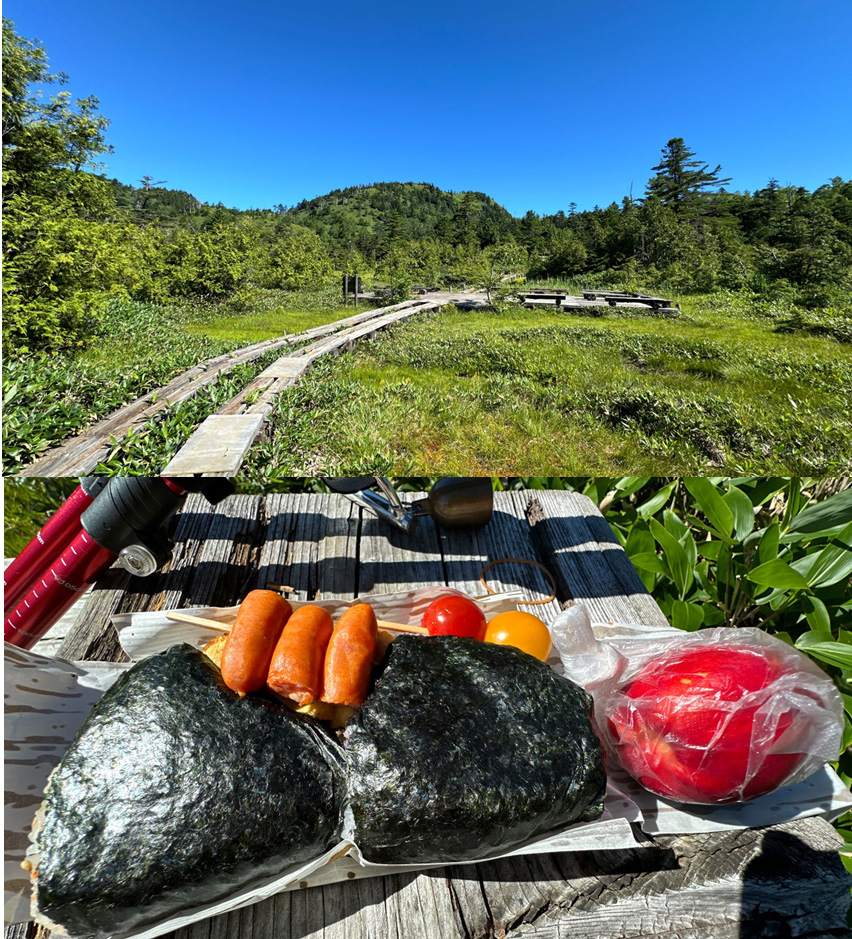 志賀山の手間にベンチが設置された休憩エリアがあるので宿で朝食代わりに頂いたおにぎりでエネルギー補給。