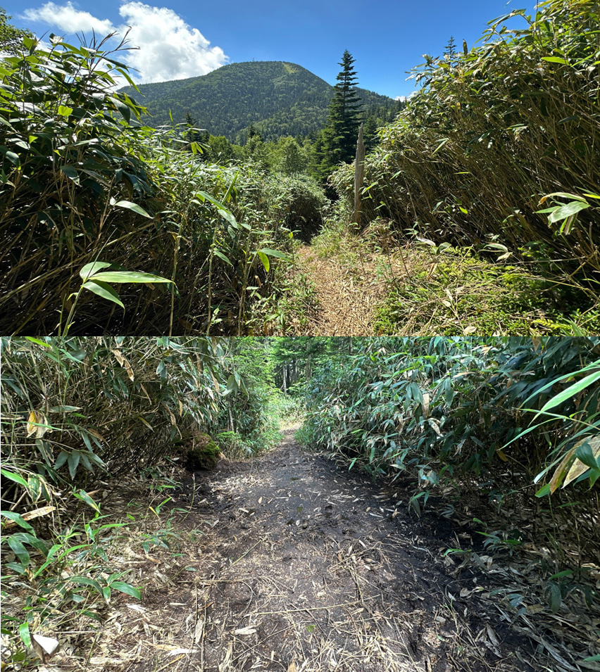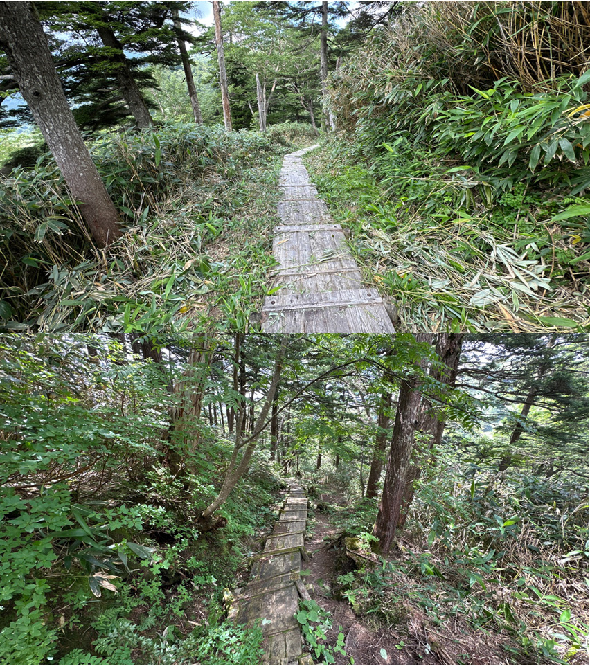 30分ほどで樹林帯に入るとなんと木道が整備されていて、刈払いもちゃんとされている状態。