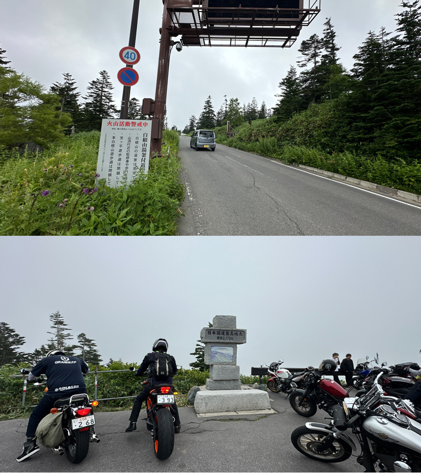暫く歩くと、国道最高地点の石碑があるんですが、写真の通り、バイクの人が凄く多い。そしてなぜか群れるんですよなこういう人たち。