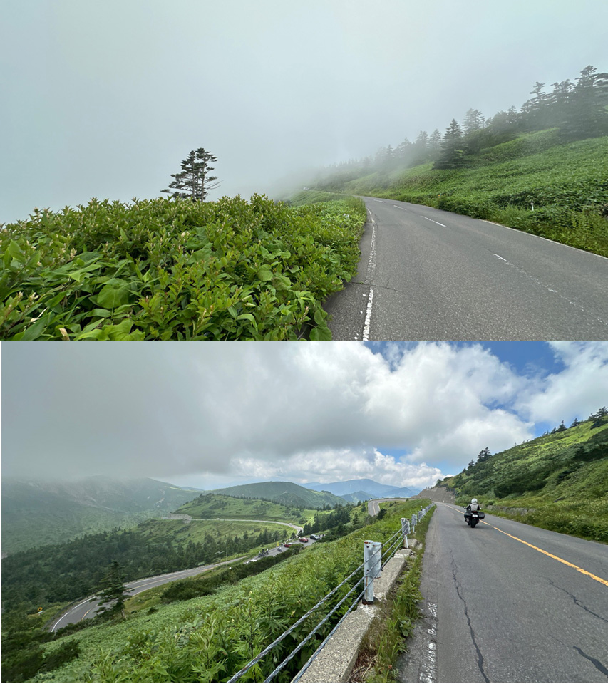 雲に覆わえれて先が見えない道路をずんずん進んで行くと白根山の山並みが時々見えるんですが、