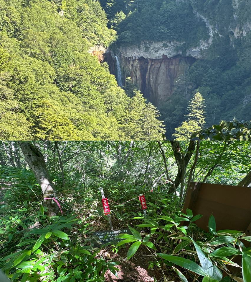 少し進んだところにこの滝の下まで行ける道があったんですがいまは途中で崩落箇所があって封鎖されてます。