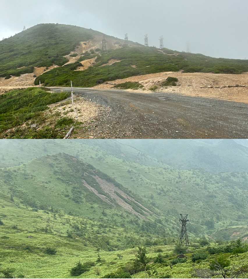 下のほうに見える鉄塔の辺りまで降りていくと壊滅した集落のの跡地へ行けるらしいんですが、