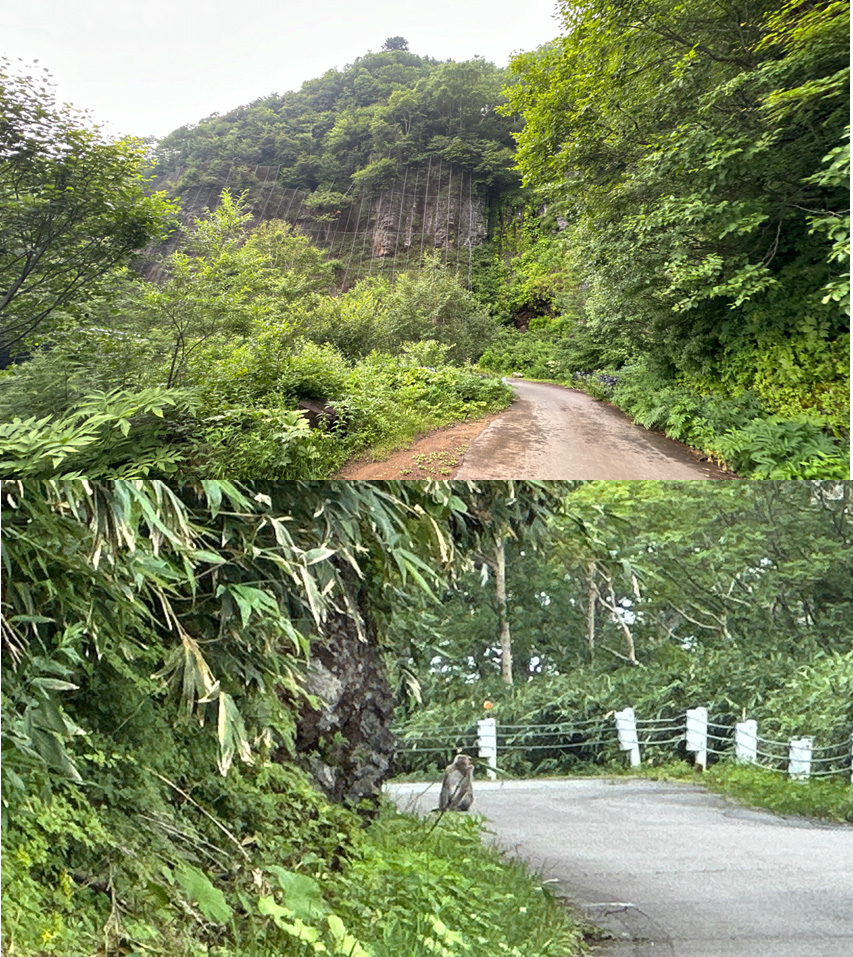 途中の道路で、なにかいるな…と思ったら猿の群れでした。こっち見てすぐに逃げていいましたが、